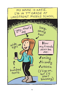 As you can see, the ways their stories were told puts them even more in contrast, with Emmie's more introspective, text-heavy in the style of illustrated books like Diary of a Wimpy Kid and Katie's side of things depicted colorfully in comics format.